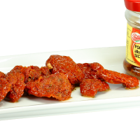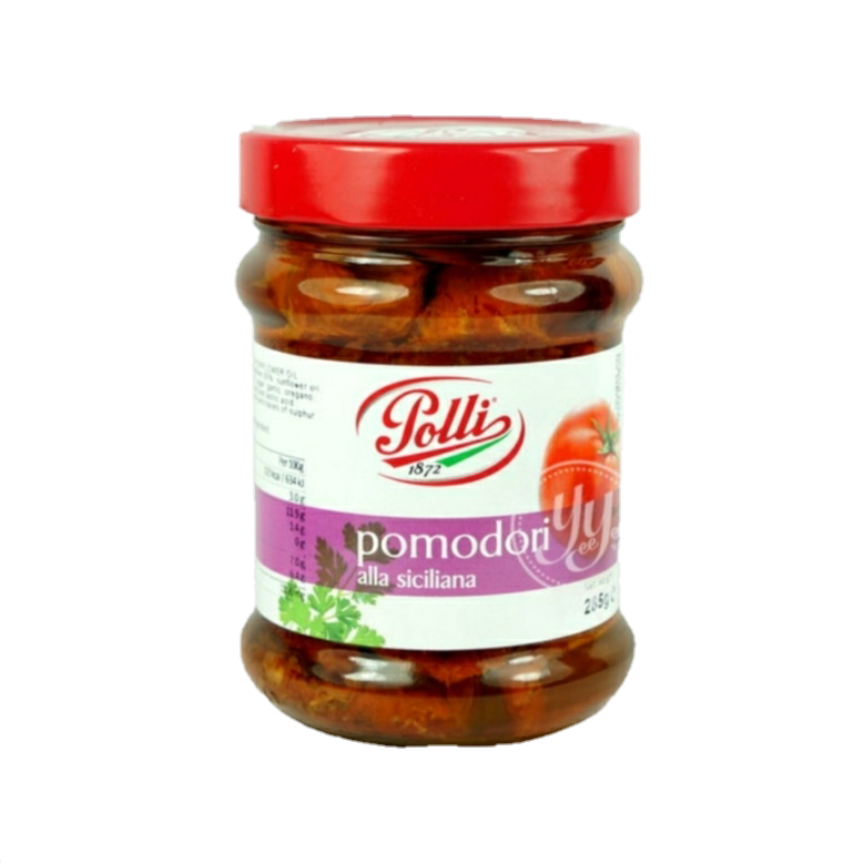 Ingredients : sundried tomatoes 50%, sunflower oil, extra virgin olive oil, salt, sugar, garlic, oregano, acidity regulator : citric acid and lactic acid, antioxidant ; ascorbic and acid and traces of sulphur dioxide, pepper